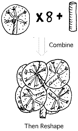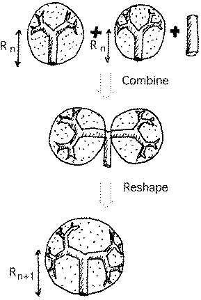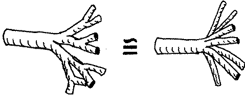 The point where the main arteries of the two nlevel brains are joined is now in the middle of the (n+1)level brain so a extra artery of length R is needed to take the blood to that point (Fig 1). Similarly an extra vein will be needed. The radius of the new tubes, rn+1, will need to be rn, where rn is the radius of the largest tubes in an nlevel brain (Fig 2), in order to supply the required flow of blood.