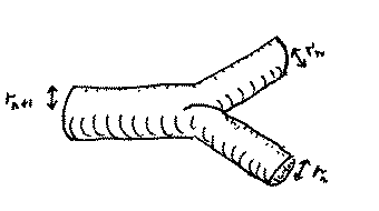 The pressure difference across this extra length of blood vessel consists of the separation loss at the point of branching and the viscous drag in the tube. A separation loss is the pressure needed to overcome an obstruction to fluid flow such as a junction. Taking a rather extreme case of a tee-junction, the loss will be 1.8rv2Pam2s2. The blood speed will be about 0.1m/s or less, so the separation loss will be typically less than 18Pa for each level of branching. A human heart produces around 100mmHg=13kPa so the separation losses are negligible. The viscous drag (q"n) can be calculated from the dimensions of the tube, the blood speed (v) and the viscosity (h) by approximating the flow to a laminar flow in a straight cylinder and using Poiseuille's formula. The result is 8hv (Rn+1)(r"n+1)"2. For each successive level in the branching hierarchy, this drag term decreases by a factor of 22/3 so the total drag through all the levels of branching cannot exceed