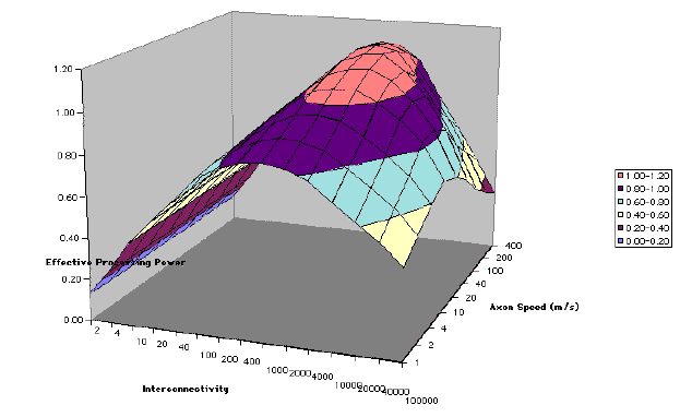 Clearly the system as a whole will be matched when the transit and processing time are equivalent. Interestingly the resulting figures are more or less equivalent to the pulse width, showing a degree of universal optimisation. The synapse processing time of about 2 ms allows us to predict the number of synapses in the path to be about 4-5 (to give a matched delay). This gives an interconnectivity of the order of 104. Hence, using this analysis, we can say that the brain has an interconnectivity of 104 not because this is ideal for some algorithmic reason, but because this is the ideal trade-off, for this particular combination of cellular technologies, of processing and transmission speeds. When modelling the brain we should therefore be wary of placing over importance on the interconnectivity arguments. Fig 5 shows the overall consequence of changing interconnectivity and/or increasing the size of myelinated neurons to obtain more speed on the information processing capability per unit time. Note the broad performance plateau, with the human brain lying about 20-30% below the optimal, but with the optimal processing ability corresponding to a brain about twice the current volume. Increases in size give little performance gain but would cause immense inertial shock problems. Also note that the flatness of the plateau permits quite wide errors in assigning modelling values to the various parameters without significantly changing the conclusions. Figure 5: Information processing vs axon speed and interconnectivity. Interim Conclusions 2 Limitations to biological enhancements
