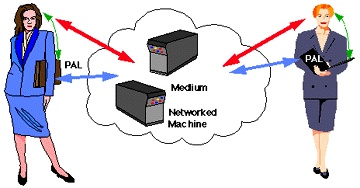Whether the PAL would be the user's only device is uncertain. For example, it might not yet be possible to include all the required functionality into a small, portable device. If not, then the user would still need a larger base at the office or home into which he would plug his PAL to achieve full Medium functionality. The PAL would thus be able to link to the Medium when necessary. Outside, this would rely on mobile communications, making good use of the fixed mobile network too. It would provide access to any communications or processing the user might require.