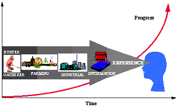 The vision of mankind's development from hunter gatherer, to farmer, to industrialist and more recently to information worker is now well established (Fig 13). It is now worth posing the most fundamental of questions - what happens next? It is already reasonably easy and clear to see where we are going - towards the experience society. After all, access to information is just the first step towards accessing direct experience via the network. Television and the telephone effectively extend our optic nerve and our acoustic senses over vast distances so that we can see and talk with other people. Research on tactile gloves, prosthetic limbs, tactile and prosthetic suits are already reasonably well advanced. Through virtual reality we might also soon have human reactions to sight, sound, touch and position extended to remote locations in the real world and/or computer generated worlds. Humans are fundamentally able to absorb about 1 GByte of data per second. With a modest amount of compression this can be reduced to 1 Gbit/s. For the moment we should treat this as a reasonably safe minimum bound on the bandwidth we should aim at delivering over the information superhighway.