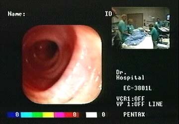 This image is produced by a revolutionary system that does away with the need for X-rays and fluoroscans. As the endoscopist moves the instrument, the new path is immediately displayed in three dimensions. A third image relayed to the remote expert was a video camera view of the patient and attending medics. All three images were conveyed to the remote end of the link in a variety of formats that suited circumstances and requirements at the time, for example, picture in picture (Fig 6), video fade in/out, etc. At the patient end of the link the attending endoscopist and nursing staff had a head and shoulders view of the remote expert or trainees and were able to communicate in a completely hands-free style.