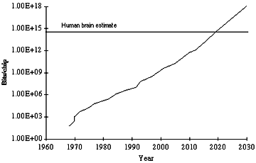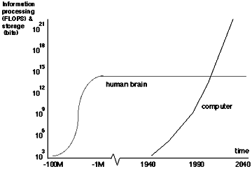 There is no doubt that our brain of some 10 11 neurons is a remarkable machine. Unfortunately, it is one that will see no significant enhancement in the next several thousand years if left to natural development. In dramatic contrast the electronic computer is evolving at a rate that doubles its ability each year or so. This will see desk top computers 10 3 times more powerful in ~10 years, 10 6 times in ~20 years, and possibly 10 9 times in ~30 years. A sobering thought! Interestingly, the telecommunications, electronics and IT sectors are the only ones able to sustain such exponential growth as all other human activities most definitely face physical limits that are all too visible. IT and communication can continue the annual doubling process for at least another 30 years on the basis of the technology we already know about and understand.