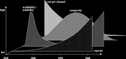 The history of telecommunications has seen a remarkable progression of technology meeting mankind's needs, with an accelerating ability to transport information at lower power and material costs year on year. As each technology has saturated at some fundamental capacity limit, it has been overtaken by some timely and often spectacular (and usually unexpected) advance. This is illustrated in Fig 1 for copper line systems. Here we see the limits of open copper conductors overtaken by loaded twisted pair cables, to be then surpassed by electronic amplification, Frequency Division Multiplex (FDM) and Time Division Multiplex (TDM) on twisted pair and coaxial cables. By 1960 it was becoming apparent that these cable based technologies would present fundamental limits to further progress and growth within a decade or two. The fundamental capacity in terms of the number of simultaneous telephone calls that could be carried, coupled with the basic cost in raw materials, physical space, power and investment was set to create barriers to further progress. With hindsight this situation can now be seen to have posed a significant threat to the progress of the global economy.