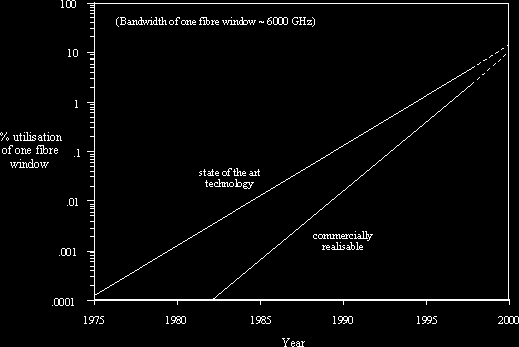 It is worth noting that, even if today's state-of-the-art 10 Gbit/s systems were to be deployed, the utilisation of fibre bandwidth is unlikely to reach even 1% for some years (Fig 3). Indeed, it is reasonable to visualise the enormous capacity of fibre satisfying telecommunication needs well into the next millennium.