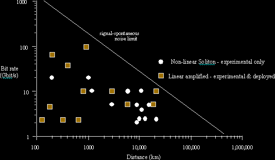 A new generation of transmission systems that exploit rather than fight against the non-linear properties of fibre are at an advanced R&D phase. The key to these systems is the Soliton: a particular pulse shape which, when correctly launched into the fibre, maintains its shape as it propagates: linear distortion (pulse spreading through dispersion) exactly cancelling non-linear portion (pulse narrowing). After a certain distance solitons do eventually succumb to attenuation and dispersion and so break down. However, by placing optical amplifiers at critical intervals along the cable, or better still by using distributed fibre amplification, pulse breakdown is avoided. Fig 4 summarises some of the bit rate/distance achievements in laboratory, field trials and installed systems.