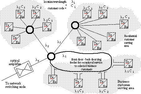 If we consider exploiting the bandwidth of fibre in a similar manner to the radio spectrum in mobile communications, we rapidly migrate towards an Optical Ether as shown in Fig 5. To address an end point terminal all that is required is the area wavelength (not area code) and the final (fine grain) wavelength for WDMA, frequency for FDMA or code in the case of CDMA. This approach could be extended to replace the central office for <200,000 lines with a 100% non blocking capability, with potential for improvement to 4,000,000 lines. At today's service levels, up to 20-million lines could be accommodated with a potential for significantly more. Beyond this the need for conventional switching of some kind becomes necessary.