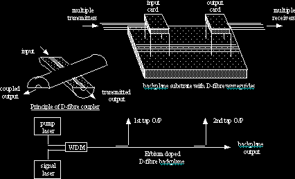 The concept of distributed fibre amplification can be applied to the data bus. For example, the optical equivalent of a "tapped bus" has been demonstrated using D-fibre couplers in a network of weakly amplifying fibre (Fig 6). Although noise accumulation eventually dominates, it is nevertheless feasible that such a bus could grow to accommodate >1000 taps. This, coupled with the ability to use fibre amplifiers to offset splitter loss in a branching network that fans-out to several million customers opens up the concept of Virtually Lossless Networks.