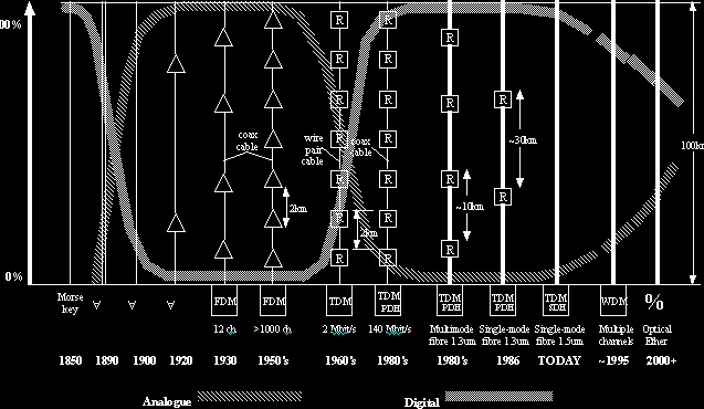 The history of telecommunications has undergone cyclic changes with regard to the use of analogue and digital transmission (Fig 7). The earliest form of digital transmission: telegraphy using Morse Code, was replaced by analogue transmission over a century ago with the arrival of the telephone. Analogue remained dominant in a FDM form up until the late 1950's at which point digital PCM was introduced. Within three decades the balance had reversed, with digital TDM substantially dominating over analogue. Today there is a hint of a return to analogue, with WDM affording a convenient way to increase fibre utilisation without recourse to high speed electronics.