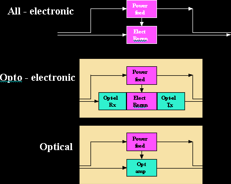 Naturally enough the first optical repeaters followed the established pattern of their electronic forebears. In fact, the first systems merely had photo detectors and lasers/LEDs glued on the end of existing system designs. But the optimisation of fibres and devices soon delivered a far more efficient set of options. So the basic question is whether to regenerate or merely amplify the optical signal. The argument continues, and is quite complex due to the non-linear fibre physics involved. To date the vast majority of optical systems employ regenerators, and fibre amplifiers have only just arrived on the commercial scene. But they offer the prospect of new signal and network forms by removing all electronics from the signal path - end to end photons opens up a new paradigm. |