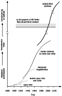 The history of telecommunications has seen a remarkable progression of technology meeting mankind's needs, with an accelerating ability to transport information at lower power and material costs year on year. As each technology has saturated at some fundamental capacity limit, it has been overtaken in a timely manner by some spectacular (and usually unexpected) advance. This trend is illustrated in Fig 1for line transmission systems. Here we see the limits of open copper conductors overtaken by loaded twisted pair cables. These are then surpassed by electronic amplification, Frequency Division Multiplex (FDM) and Time Division Multiplex (TDM) on twisted pair and coaxial cables. By 1960 it was becoming apparent that these cable based technologies would present limits to further progress and growth within a decade or two. The fundamental capacity in terms of the number of simultaneous telephone calls that could be carried, coupled with the basic cost in raw materials, physical space, power and investment was set to create barriers to further progress. With hindsight this situation can now be seen to have posed a significant threat to the progress of the UK and global economy.