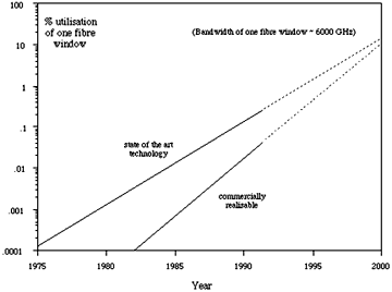 It is worth noting that, even if today's state-of-the-art 10 Gbit/s systems were to be deployed, the utilisation of fibre bandwidth is unlikely to reach even 10% for some years (Fig 3). Indeed, it is reasonable to visualise the enormous capacity of fibre satisfying telecommunication needs well into the next millennium.