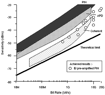 EDFA's are capable of realising a noise figure close to the 3 dB theoretical minimum, which renders them attractive as receiver pre-amplifiers to improve sensitivity.Fig 4 summarises the best sensitivities reported from which it is clear that substantial improvements (?20 dB) can be achieved over un-amplified receivers. It should be noted that the sensitivity of pre-amplified receivers exceeds that of coherent systems at high bit rates: this represents a major cost advantage.