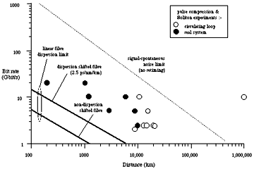 A new generation of transmission systems that exploit rather than fight against the non-linear properties of fibre are at an advanced R&D phase. The key to these systems is the Soliton: a particular pulse shape which, when correctly launched into the fibre, maintains its shape as it propagates: linear distortion (pulse spreading through dispersion) exactly cancelling non-linear portion (pulse narrowing). After a certain distance solitons do eventually succumb to attenuation and dispersion and so break down. However, by placing optical amplifiers at critical intervals along the cable, or better still by using distributed fibre amplification, pulse breakdown is avoided.Fig 5 summarises the key bit rate/distance achievements in laboratory trials to date and multi-Gbit/s transmission over international distances is clearly possible.