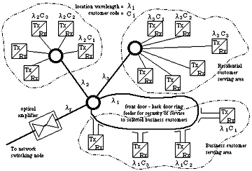 If we consider exploiting the bandwidth of fibre in a similar manner to the radio spectrum in mobile communications, we rapidly migrate towards an Optical Ether as shown in Fig 6. To address an end point terminal all that is required is the area wavelength (not area code) and the final (fine grain) wavelength for WDMA, frequency for FDMA or code in the case of CDMA. Related studies have shown that this approach could be extended to the replacement of the central office for up to 200,000 lines with a 100% non blocking capability, with potential for improvement to 4-million lines. At today's service levels with a similar level of call/service blocking, up to 20-million lines could then be accommodated, with a potential for significantly more. Beyond this level the need for conventional switching of some kind becomes necessary again.