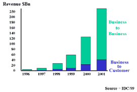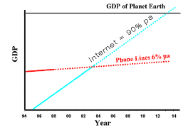 Views Money, Chips & Bits Prologue "Heavier-than-air flying machines are impossible" "(Television) won't be able to hold on to any market it captures after the first six months. People will soon get tired of staring at a plywood box every night" "I think there is a world market for maybe five computers" "There is no reason for any individual to have a computer in their home" "640K ought to be enough for anybody." During the industrial revolution railways wiped out barges and canals, the car wiped out the train, and aircraft sank the big liners sailing the North Atlantic. But more significantly, electronics, thermionic tubes, transistors, integrated circuits, satellites and optical fibre arrived to give us telephones, radio, TV, computers and networks of incredible performance, and all unimaginable only 50 years ago. Moreover, these are all at a cost that everyone can afford, and they have totally transformed our business and social lives in less than one human generation. We have seen the systematic destruction of old industries by the arrival of the new over millennia. And today we look into our crystal ball and try to gauge and predict the implications of the information revolution. Without doubt the internet looks set to be the biggest paradigm buster we have ever seen. It is touching and changing everything we do, whilst enabling a new and vigorous economy of bits. In this world entire economic sectors and industries are being destroyed or radically transformed in just a few years. In some cases the changes being enacted are so radical, we might ask; is this the end of the old financial world, its institutions, and even money? The Plot ![]() Fig 1. Internet Hosts - Log Scale ![]() Fig 2. Internet Hosts - Linear Scale Bits & Chaos For telecommunications networks coffee is now just one of many strange attractors. At a large conference no one is using a mobile phone during the proceedings, they are listening to the speakers, until coffee arrives at 10.15 that is. Within minutes over 100 mobile phones are out and people trying to make calls. Not surprising then that the cellular phone site falls over and people are disappointed. A few weeks ago a ladder fell of the back of a builders truck onto the fast lane of the M25. Every vehicle that swerved to miss the ladder tried to call 999, and the emergency service was disabled for over an hour until the ladder was removed. Plane and train cancellations, traffic jams and budget changes to the price of petrol all constitute very new strange attractors. Similar crowding and swarming behaviours are also visible at ATMs, banks, and stores when the sales start. The internet seems to have an infinity of strange attractors that promote chaotic action on a huge scale. Within minutes of the latest Star Wars Movie site going live it was receiving thousands of hits per hour. For weeks it was completely log jammed, and so were or all the arterial routes leading to it. Let us put some dimensions to all this. The old telephone network was engineered to cope with you and I making an average of 3 telephone calls every day of 3 minutes duration. The aggregation of millions of phone lines saw a peak-to-mean traffic ratio of around 3 - 4. On the internet things are far more volatile with reported peak-to-mean ratios of over 1000. Fig 3 gives a sample of activity at one ![]() Fig 3. Net Visitors Come in Packs Adam Smith got IT Wrong The Bit Economy ![]() Fig 4. Internet Growth Eclipses the Telephone Network and the GDP? Selling More ![]() Fig 5. USA E.commerce Revenues Gross Bit Product 'For investors it is the consummate measure of economic activity because it dictates how investments will perform. The stock market likes to see healthy economic growth because that translates to higher corporate profits. The bond market doesn't mind growth but is extremely sensitive to the economy growing too quickly and paving the road to inflation. By tracking the GDP, investors will know what the economic backdrop is to their portfolios'. This seems to be based more on doctrine than any practical basis. The definition of GDP is delightfully varied, but broadly falls inside the following envelope; 'A measure of the total production and consumption of goods and services - the market value for all final goods and services produced within a nation in a given time period. Intermediate goods such as plastic, glass, wood, cotton, etc are not counted since they are not in their final state. Including only final goods and services prevents double counting and avoids a GDP overstatement. Final goods include household purchases since these items are not used to produce other goods and services. GDP consists of four key components: Consumption (C), Investment (I), Government (G), Net Exports (NE)'. So the: From any system design stand-point it is hard to see how the economy of our planet could be accurately defined, or be even remotely indicated, by a single one-line linear equation. Where are the black, grey and bit economies in all of this? For sure they are very real and very significant, and in the case of the grey and bits, growing very fast. From a practical standpoint it seems that the GDP should be principally defined and measured in terms of some entropic measure related to the transformation of materials and bits. Their actual and final place, method, and mode of consumption may turn out to be a secondary effect in the overall rating. The accepted definition and formula above (1) seem to fall far short of the mark, and I suspect that the true GDP is actually tracing some exponential curve like Moore's Law for chip development and performance. If this is the case economists can expect some serious repercussions from sticking with an 18th Century perspective and not embracing the Gross Bit Product. One day they may find their world has gone, along with the significant tax revenues it generates. If so, it will have been replaced by a bit economy growing at an exponential rate. ![](