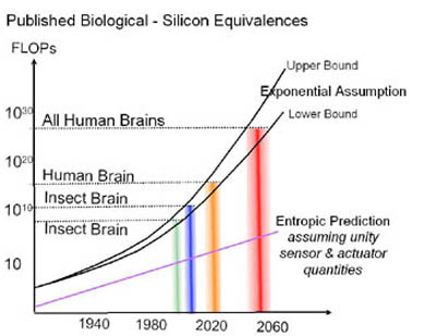 What does all this mean? With the arrival of low cost sensors and their rapid deployment on the periphery of networks, and robotics, we are really much closer to achieving truly intelligent entities than ever before. Couple this with the creation of addressable databases and learning systems, then the opportunity for 'intelligent outcomes' is racing ahead. But for singular machines, it is a 'logarithmic or linear race' and not exponential! Only if we network vast and exponentially growing numbers of machines will we see the previously assumed (and feared) exponential intelligence outcome.